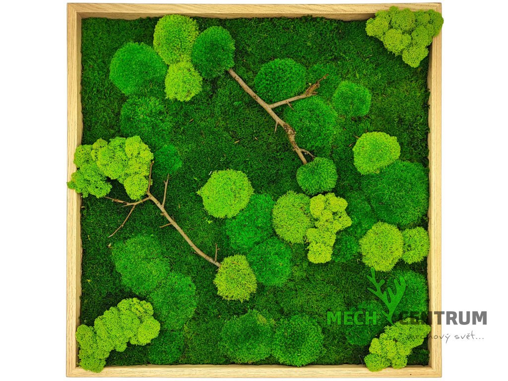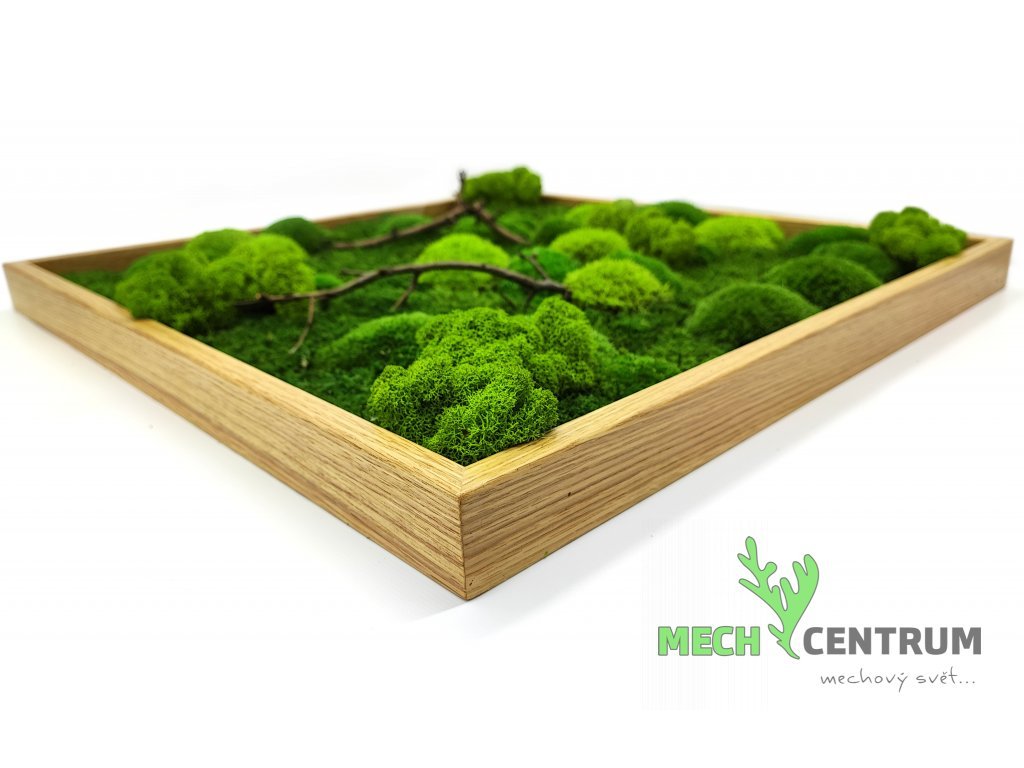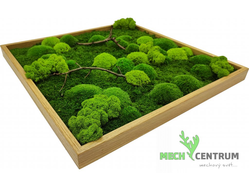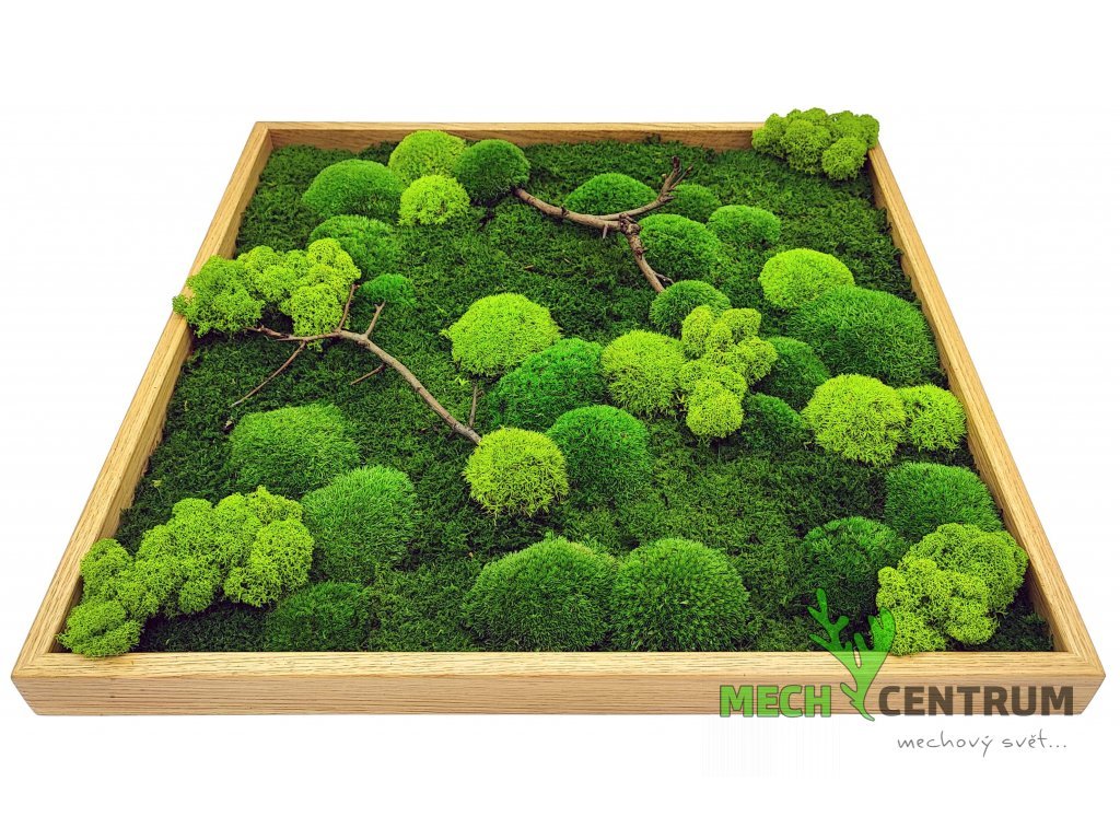 Krásný a kvalitní dekorativní mechový obraz v dřevěném dubovém rámu s výplní kombinace mechů + větvičky bonsai.