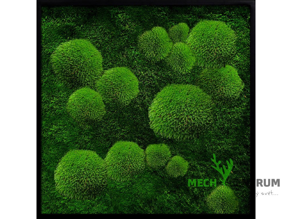 Tmavě zelené odstíny přírodních mechů jsou zde vyjádřeny s elegancí a vkusem. Decentní černý rám dotváří sofistikovaný a moderní vzhled, který působí uklidňujícím dojmem.