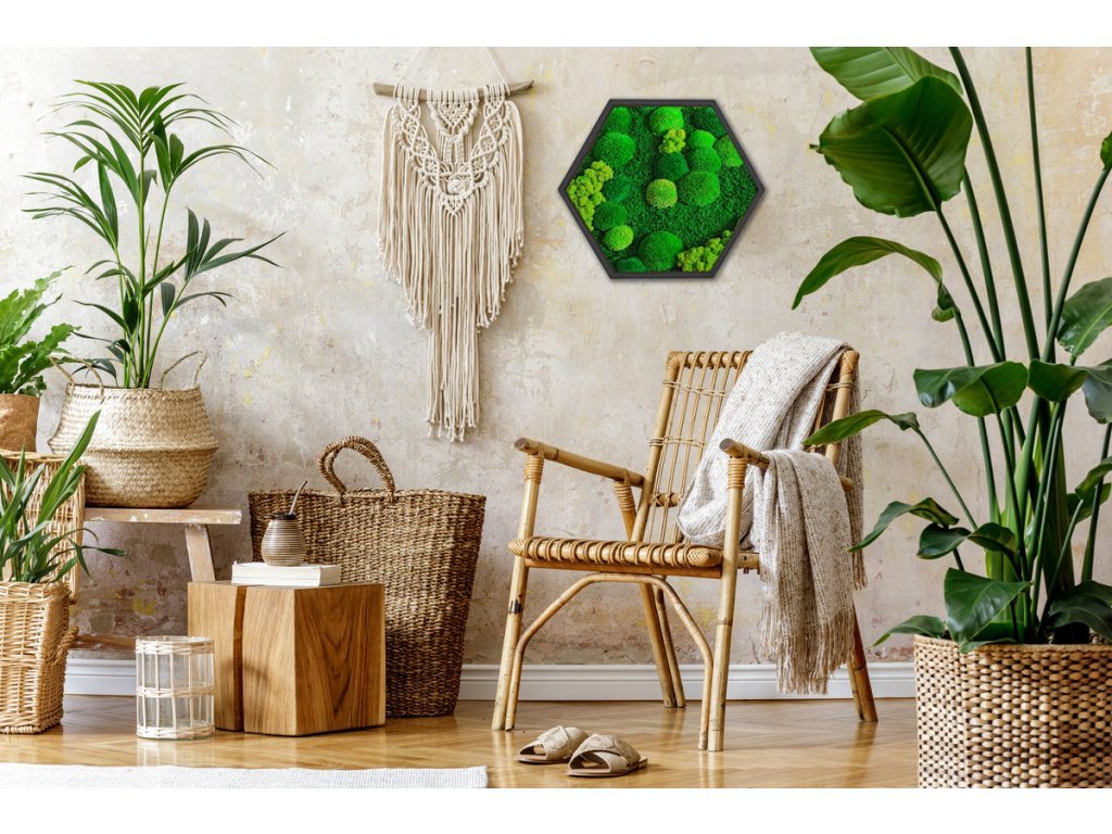 Ručně vyrobený mechový obraz v černém hexagonálním tenkém rámu je elegantním spojením přírody a geometrie.