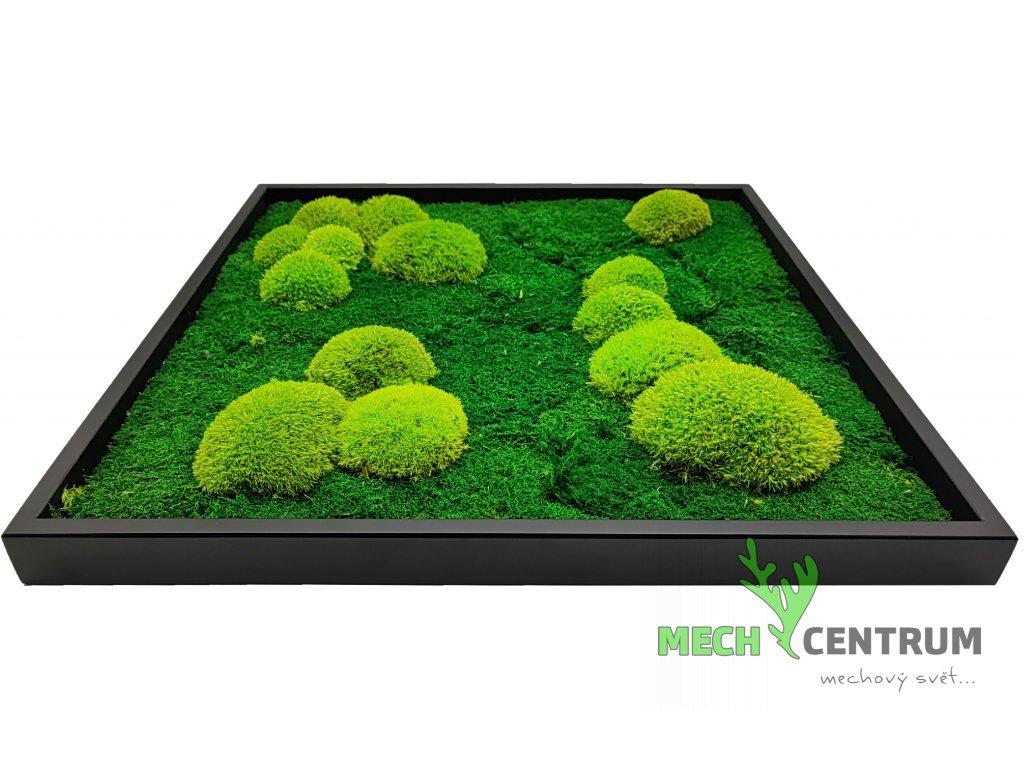 Ručně vyráběný mechový obraz s černým tenkým rámem. Kombinace kopečkového tmavého, plochého a sobího mechu vytváří uklidňující atmosféru a dodává obrazu zvláštní kouzlo.